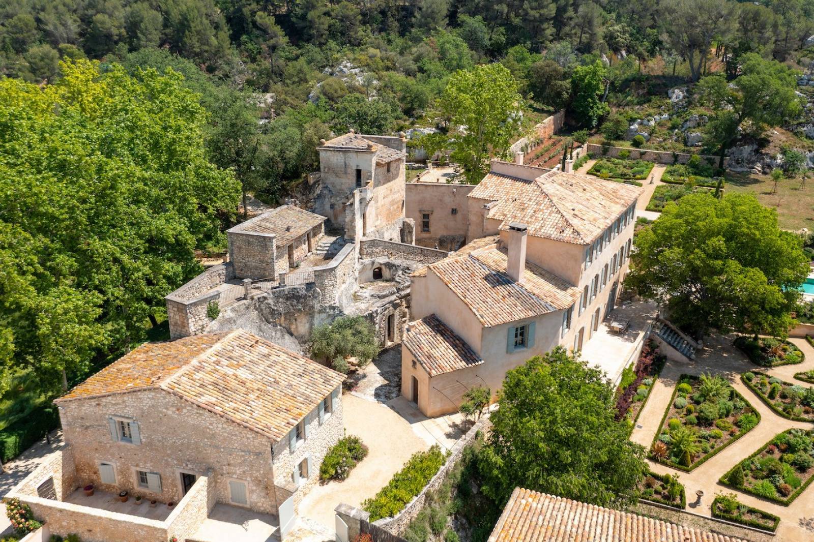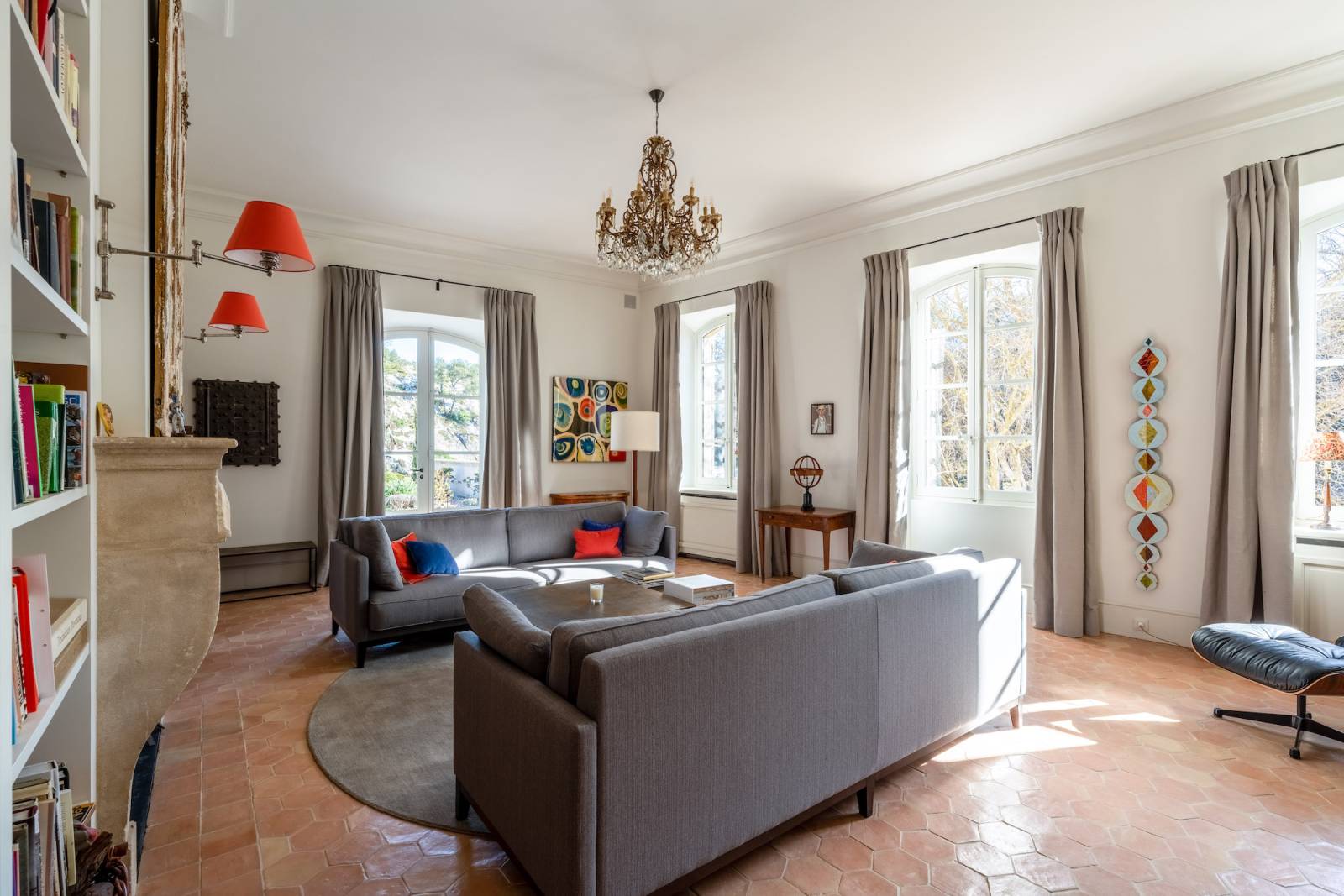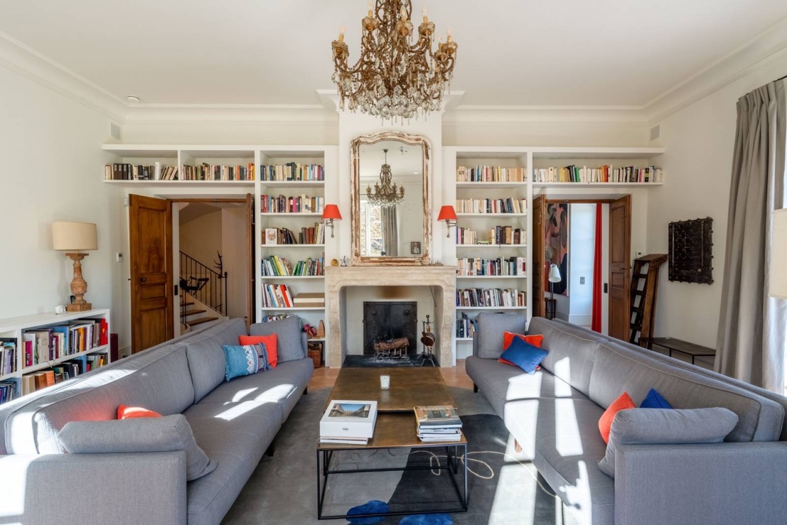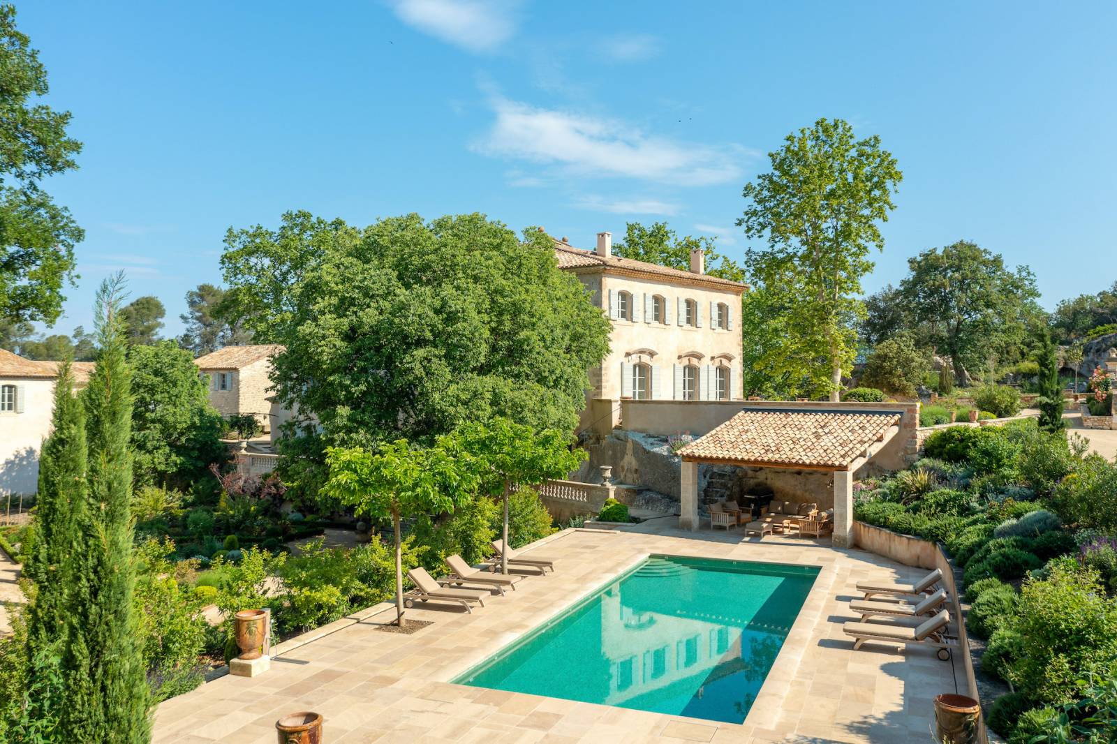 Vous pourrez compter sur trois grands salons avec cheminée et sur deux piscines extérieures pour vous rafraîchir et profiter des journées ensoleillées, à l’ombre des arbres de Provence.